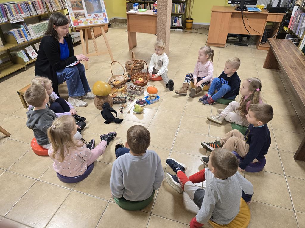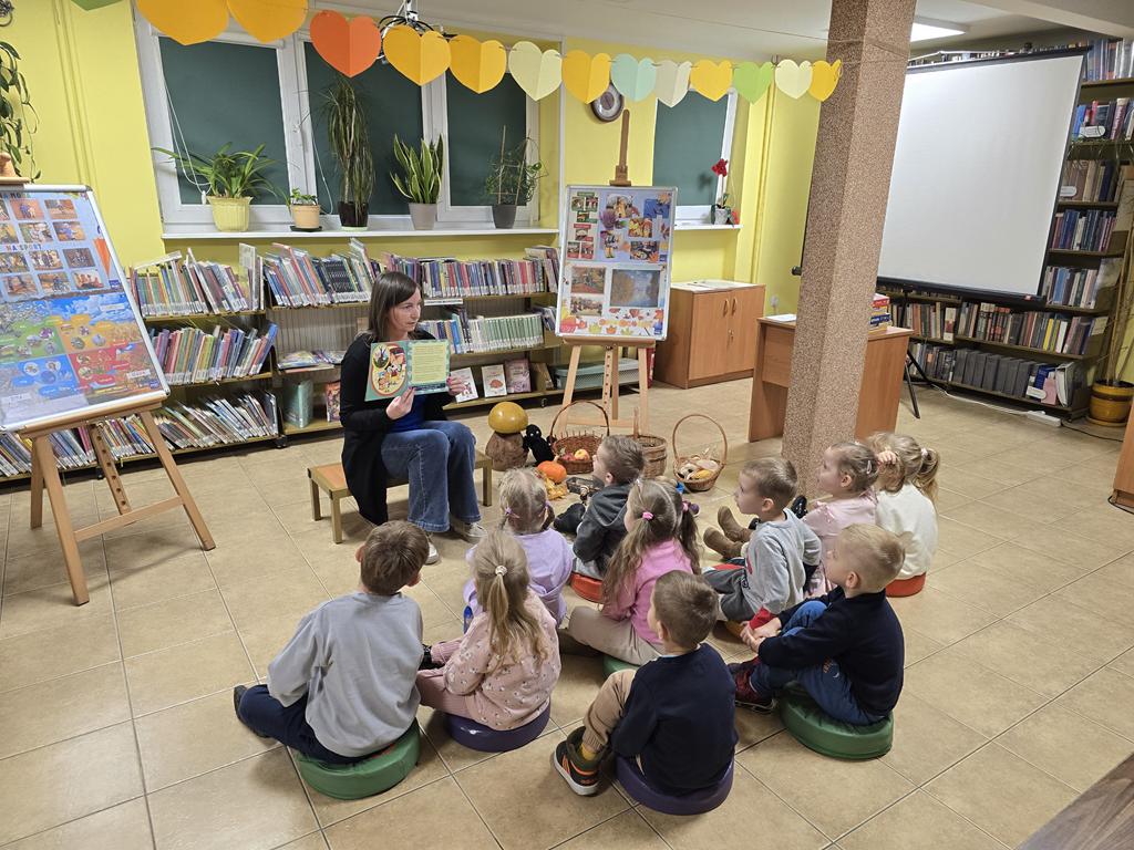 W dnia 18.11.2025 r. odwiedziły Bibliotekę „Krasnale” z Przedszkole nr 1 „Jedyneczka” w Wyszkowie. Czterolatki wysłuchały opowiadania „Skarby jesieni”, rozwiązywały zagadki, pomalowały jabłka techniką „malowanie na cukrze”. ![]()